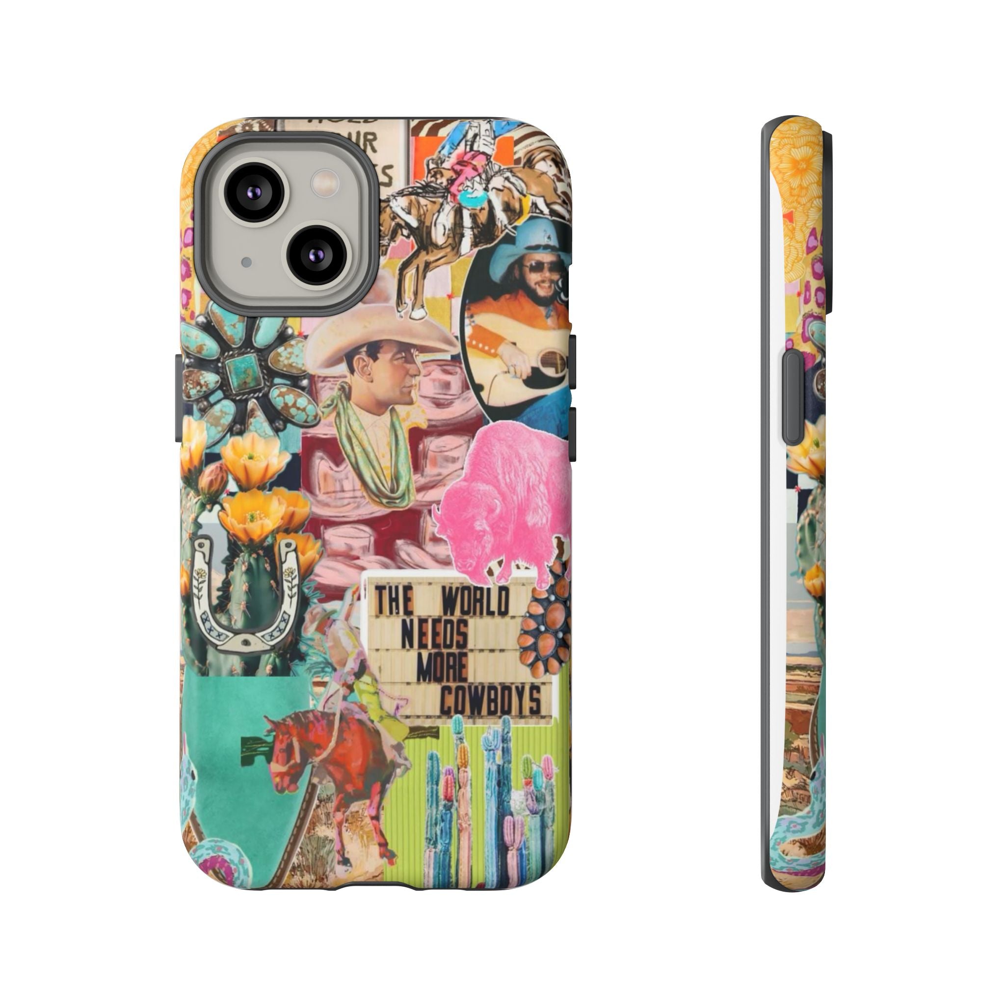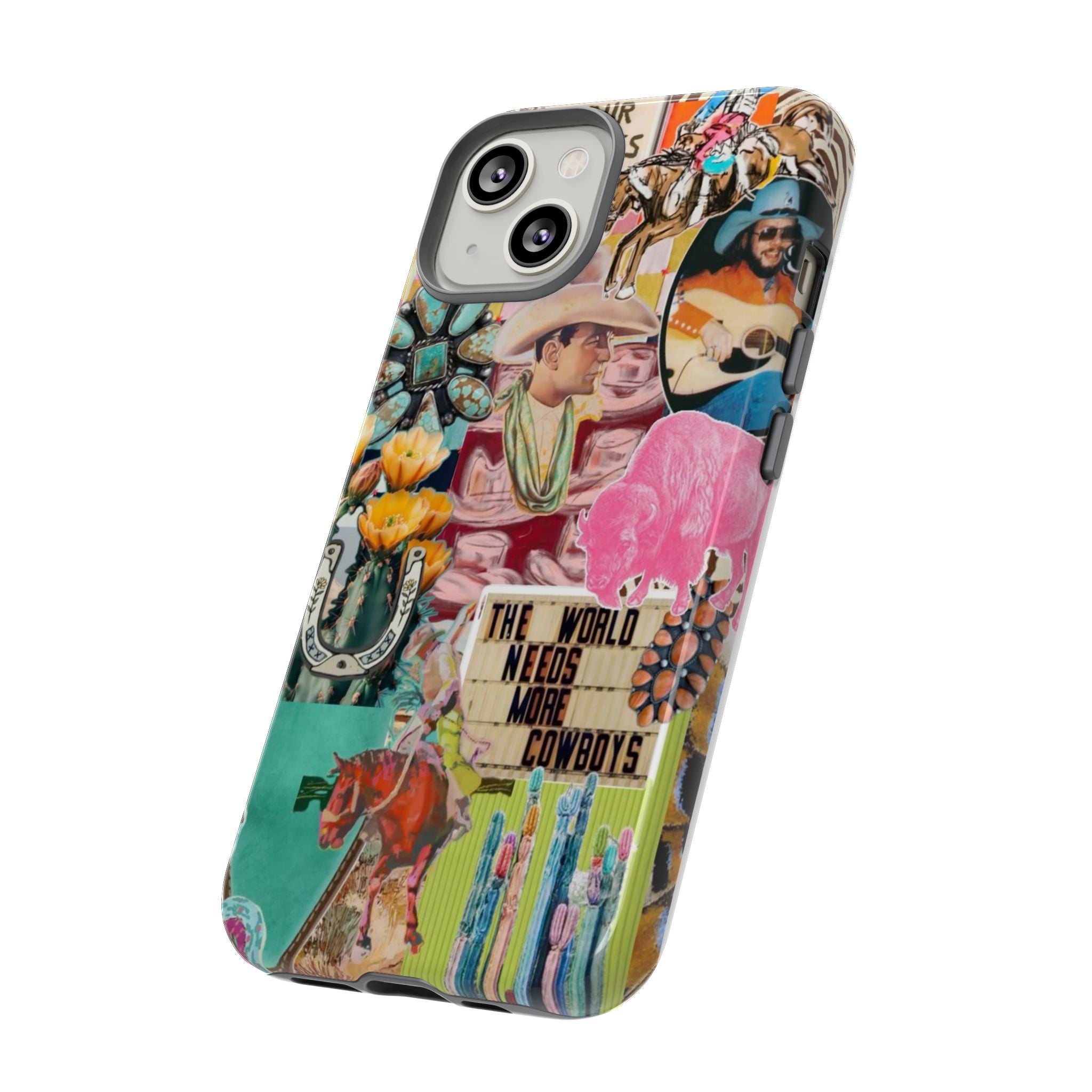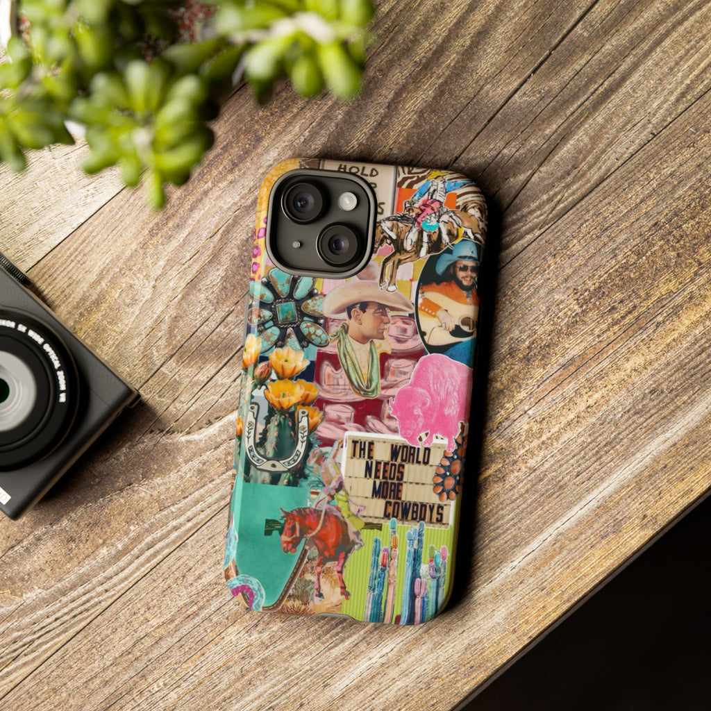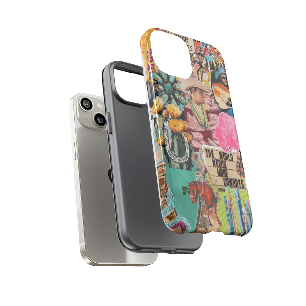 This rugged phone case brings a busy, vintage Western collage to your everyday carry. Layers of retro posters, cowboy boots, playing cards and bold signage combine into a lively, nostalgic scene that wraps fully around the device. Built as a dual-layer protector with a glossy or matte finish, it balances high-impact defense with tactile comfort thanks to a TPU silicone liner. UV protection keeps colors vivid outdoors and the precision cutouts preserve charging and port access — wireless charging is supported. For buyers who live loud, love Americana, or want a case that tells a story, this blends bold style with serious protection.