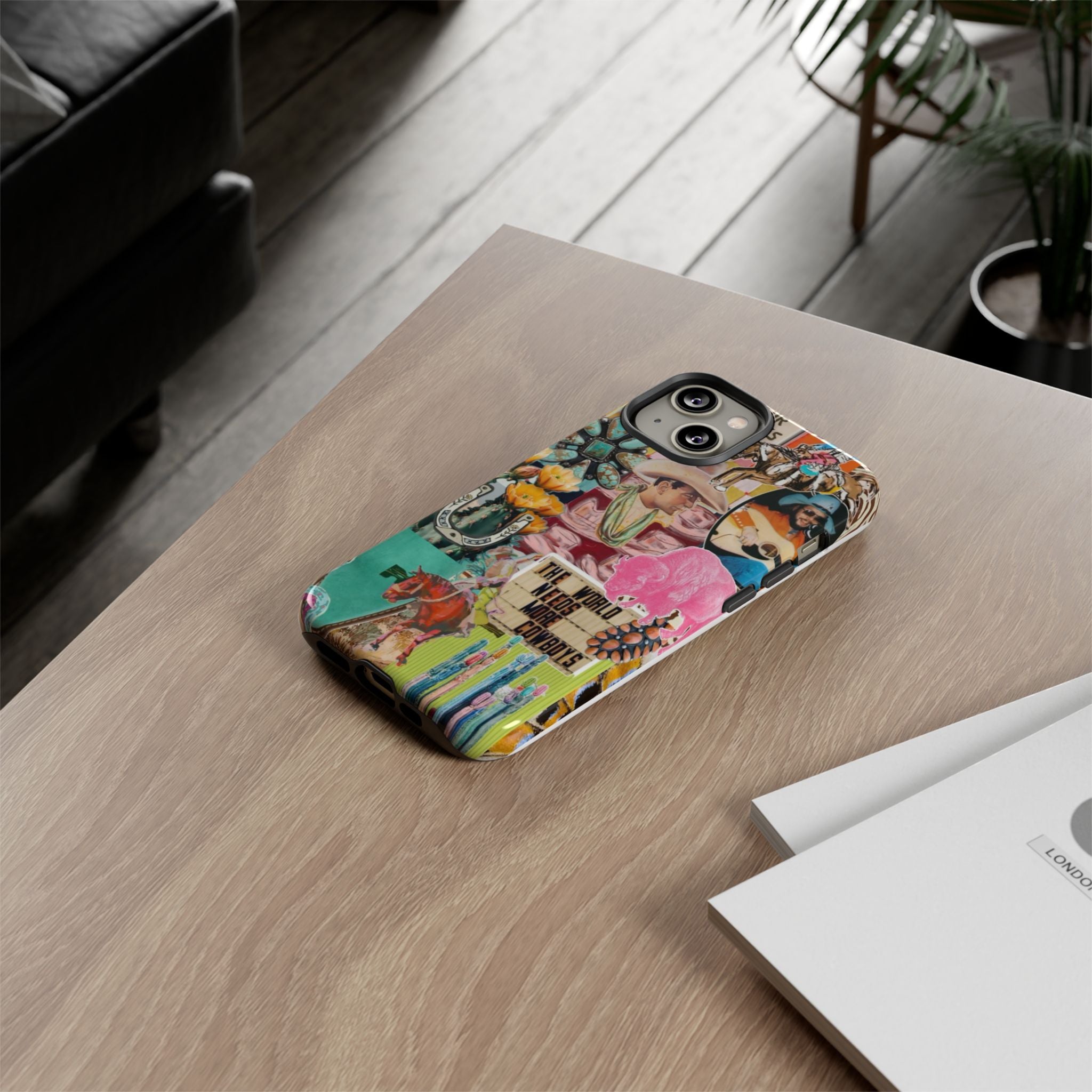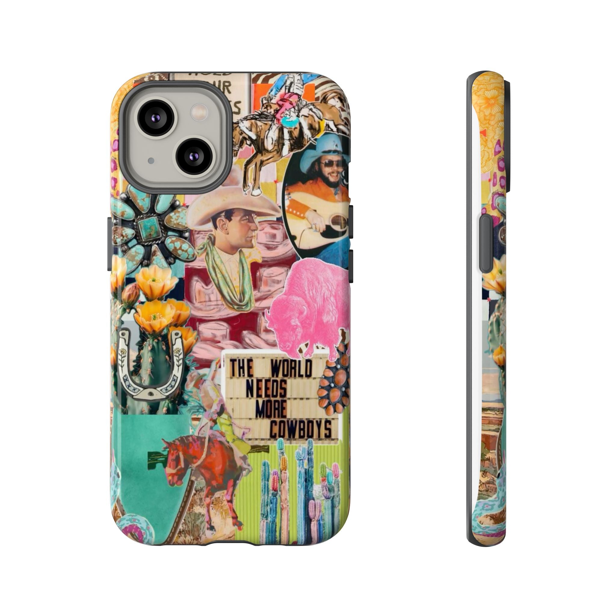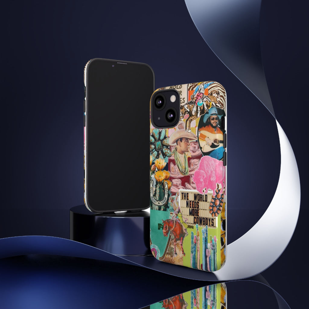 This rugged phone case brings a busy, vintage Western collage to your everyday carry. Layers of retro posters, cowboy boots, playing cards and bold signage combine into a lively, nostalgic scene that wraps fully around the device. Built as a dual-layer protector with a glossy or matte finish, it balances high-impact defense with tactile comfort thanks to a TPU silicone liner. UV protection keeps colors vivid outdoors and the precision cutouts preserve charging and port access — wireless charging is supported. For buyers who live loud, love Americana, or want a case that tells a story, this blends bold style with serious protection.